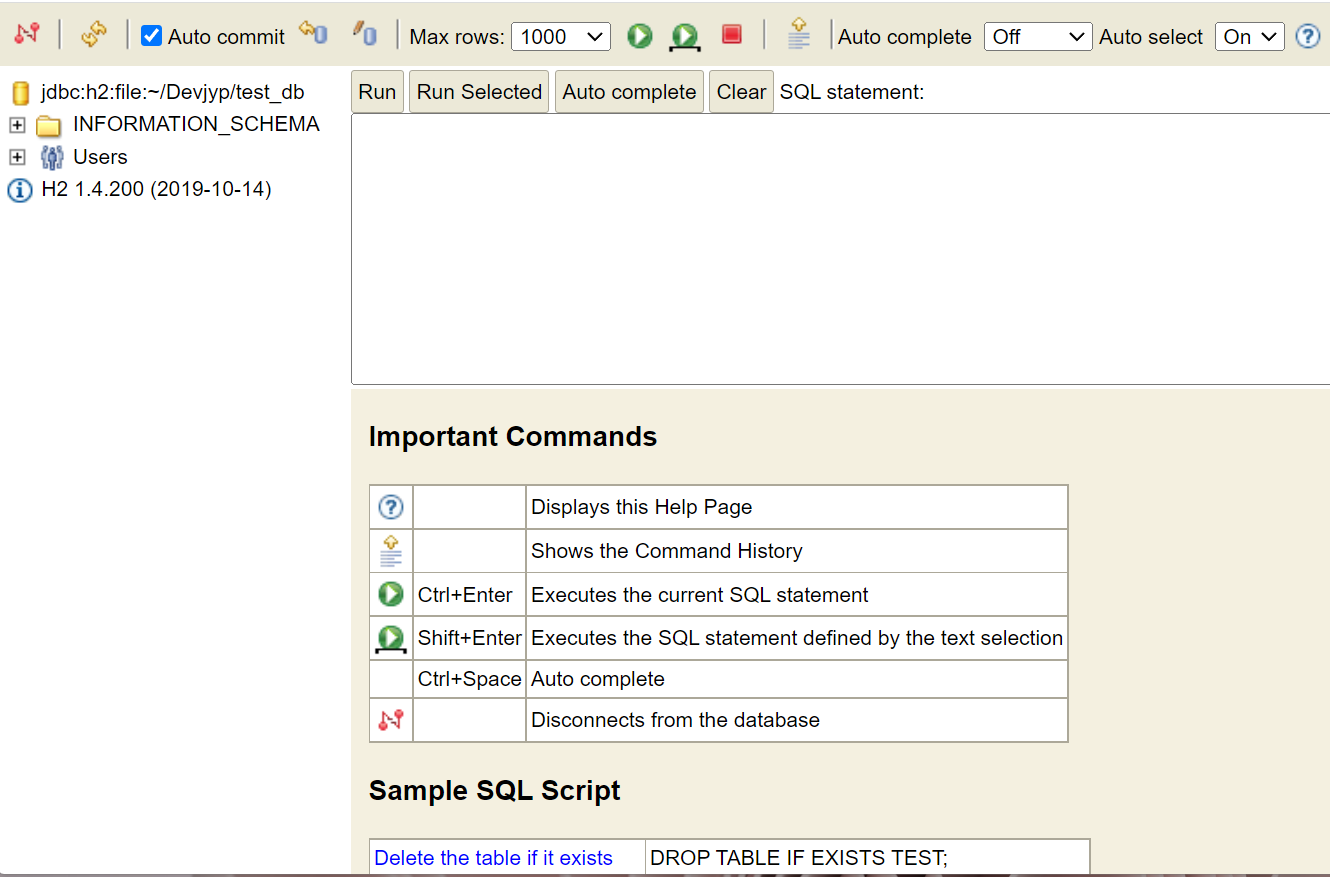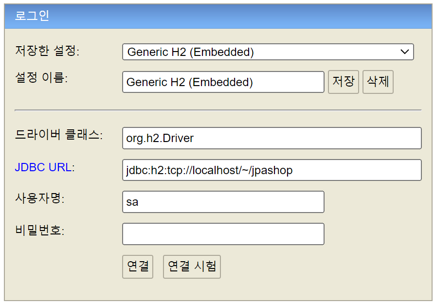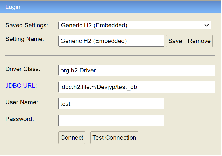 url: jdbc:h2:file:~/Devjyp/test_db #접속 URL