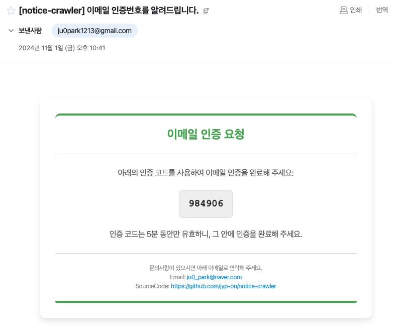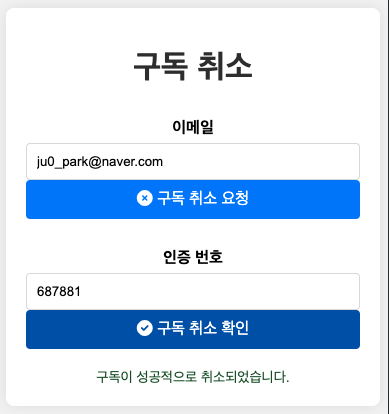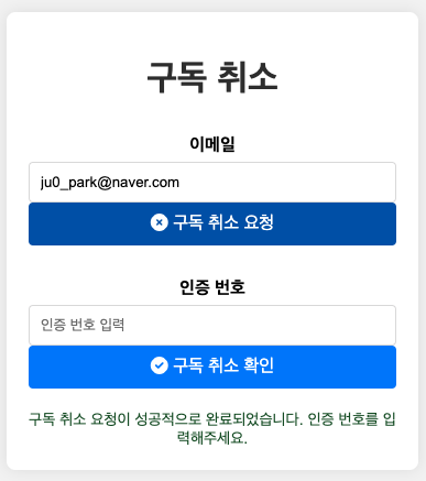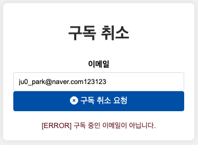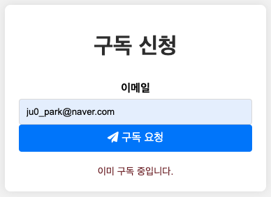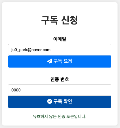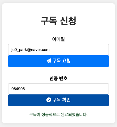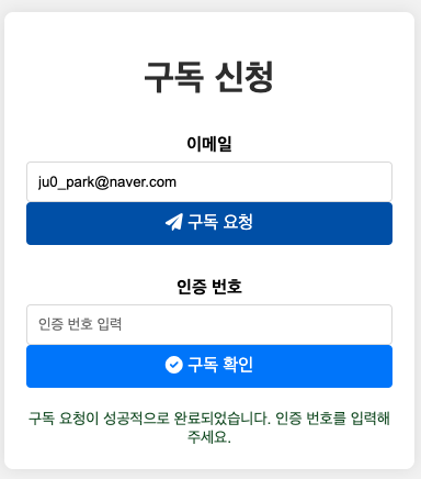 다음으로 구독신청 페이지! 메일을 입력 후 구독요청 버튼을 누르면 인증번호가 메일로 전송된다.
