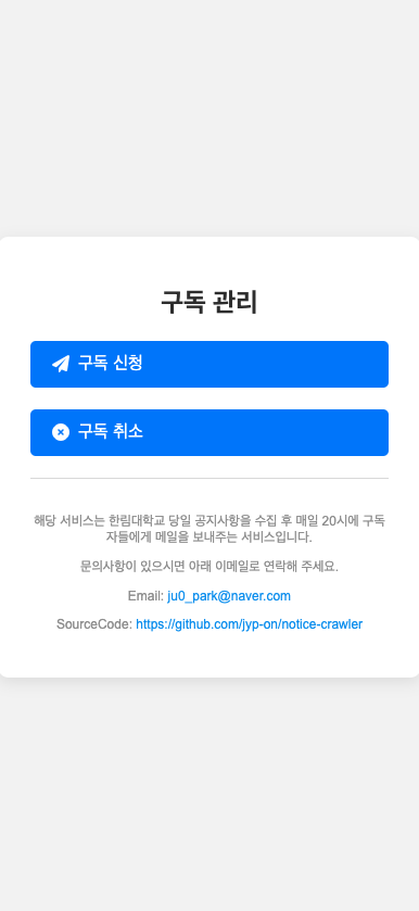 먼저 메인페이지! 서비스에 대한 간단한 소개 및 구독신청, 구독취소 페이지로 이동하는 버튼을 배치하였다.